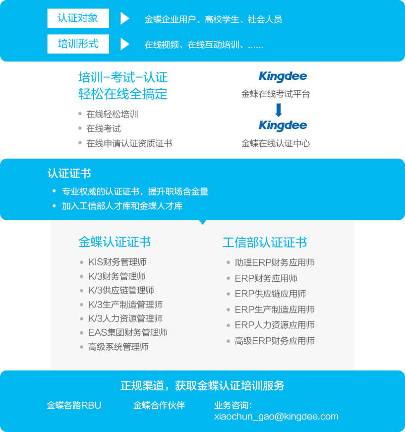 金蝶KIS人才认证体系包括单认证和双认证,认证方向为KIS财务管理师(金蝶)和助理ERP财务应用师(工信部)。旨在提升学员在ERP应用方面的知识技能,为企业信息化升级提供大量信息化应用型人才。